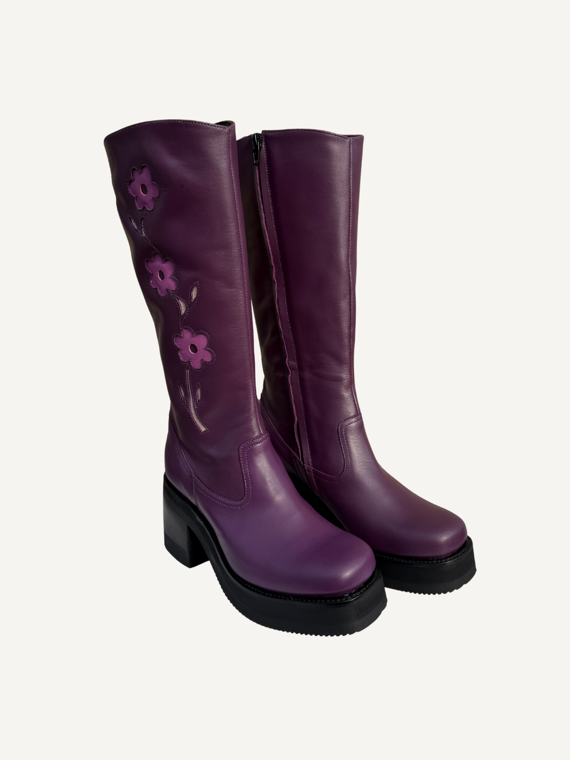 These 70s Platform Boots in Purple are handcrafted in Spain. The combination of purple flowers and silver glistering leaves makes this a true show stopper for fashionistas. Our boots are made of the finest leather, and over time will adjust and mould to fit your feet perfectly. Our boots complement any style, whether you’re a 70s vintage babe, a Bohemian soul, a Western cowgirl, or just looking to spice up your style! These boots are a statement, investment piece that will elevate any outfit.