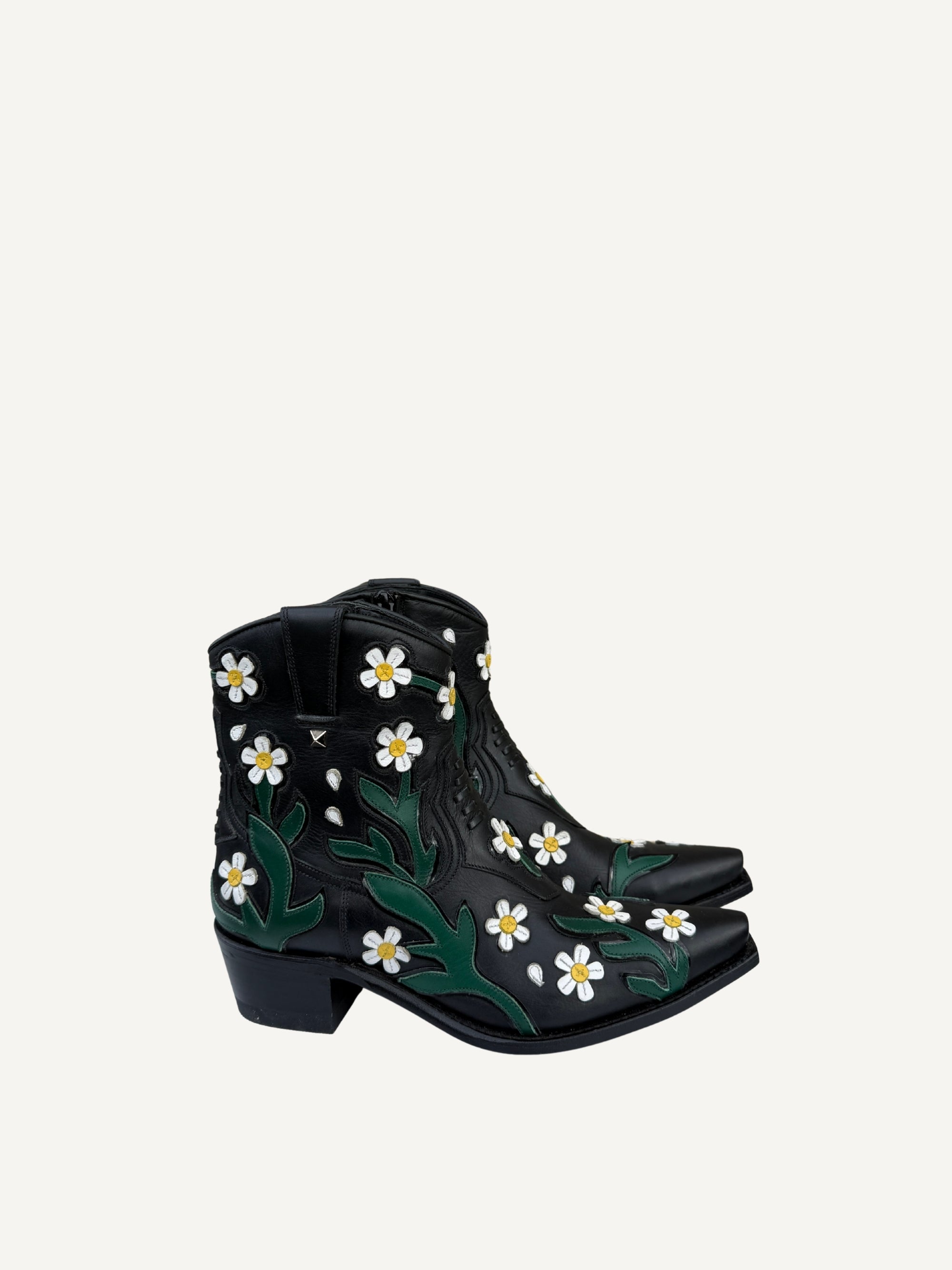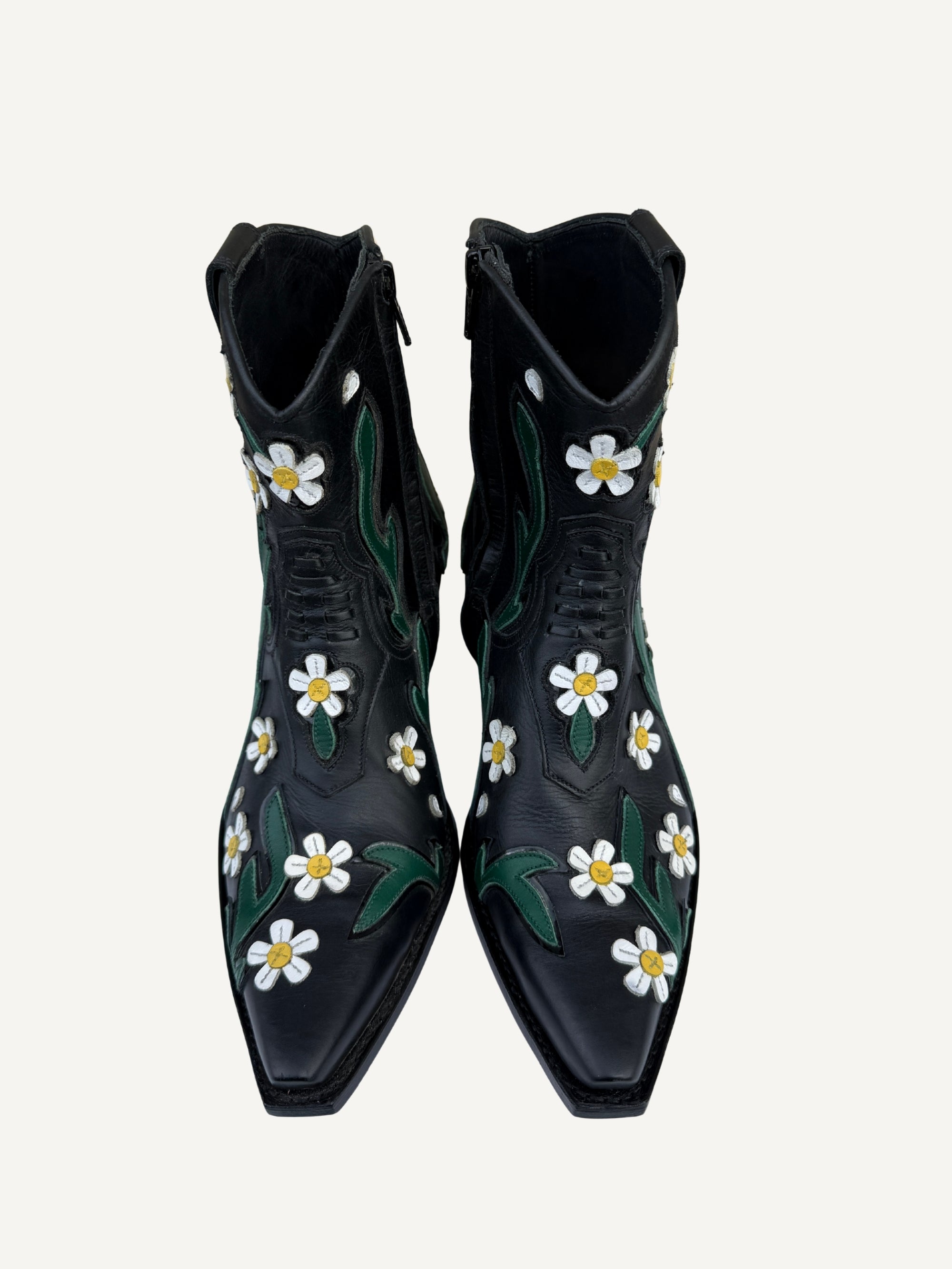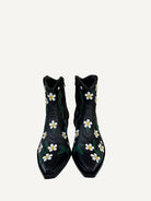 A western boot with runway energy. Original Valentino Garavani Ranch boots in black leather, finished with floral embroidery that brings the romance all over. The silhouette stays sleek and sharp, balancing statement detail with an easy, wearable attitude. Retail price is $1675.