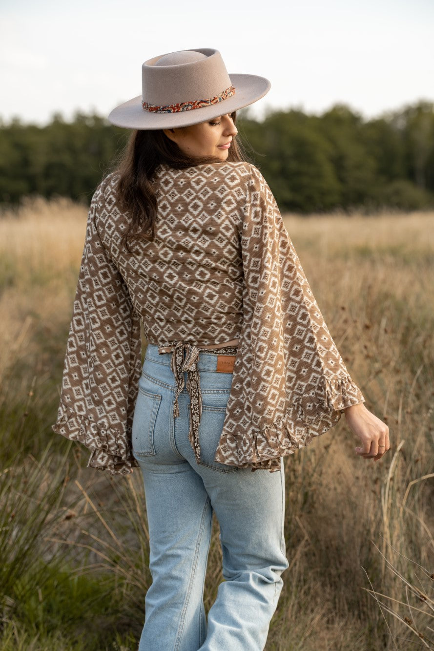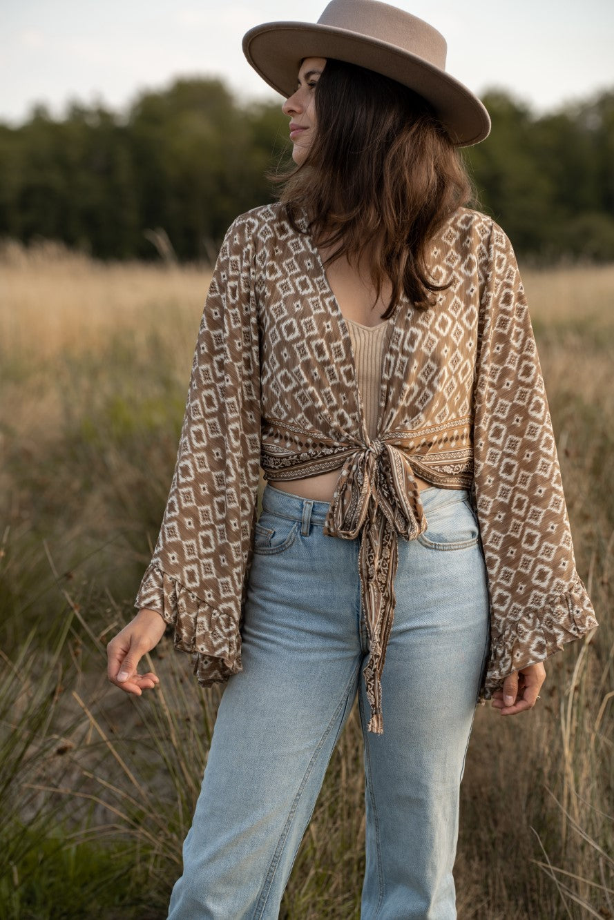 It’s Time to Get Creative With Your Layering! Wrap Yourself in vintage elegance this spring! Our kimono-style wrap tops for women are a perfect blend of comfort and sophistication, offering a flattering, adjustable fit that complements every body type. Whether layered over a simple tank or paired with a flowing skirt, these tops add a touch of retro chic glam to any outfit. Browse through our Tops Collection for women and shop the retro frill tops to add a feminine flair to your wardrobes. If you love romantic hues, dramatic bell sleeves, vintage-inspired details, our frill wrap tops bring a soft, playful elegance to your summer outfits of the day. Designed with delicate ruffles and fluid fabrics, these tops pair effortlessly with high-waisted denim or printed long skirts for a classic flowy spring aesthetic and silhouette.