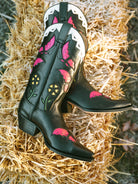 This black and pink designer pair of leather boots is the perfect balance of rock-n-roll chic meets Western ruggedness, made for the woman who takes every step with style and confidence.