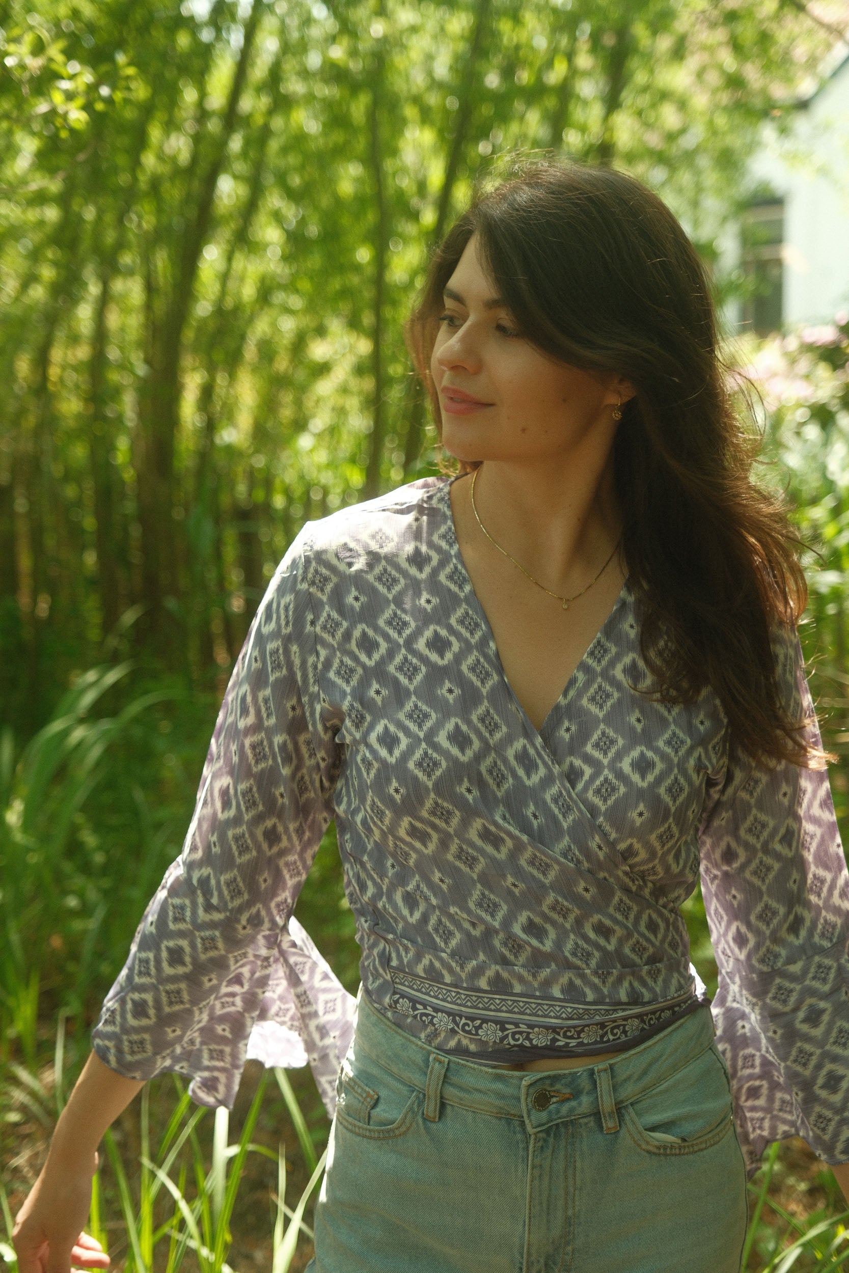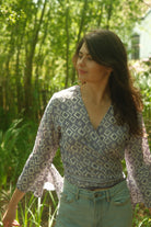Ein einzigartiges Wickeloberteil mit Blumenmuster aus leichtem, weichem Seidenmaterial und Glockenärmeln. Du kannst es so wickeln, wie du dich wohlfühlst! Für einen dezenten Look wickelst du es einfach um den Hals und bindest es hinten zusammen. Unter einer hochgeschnittenen Jeans oder einem Rock ist der Bauch nicht zu sehen. Wenn du etwas mehr Haut zeigen möchtest, gibt es viele weitere Möglichkeiten!