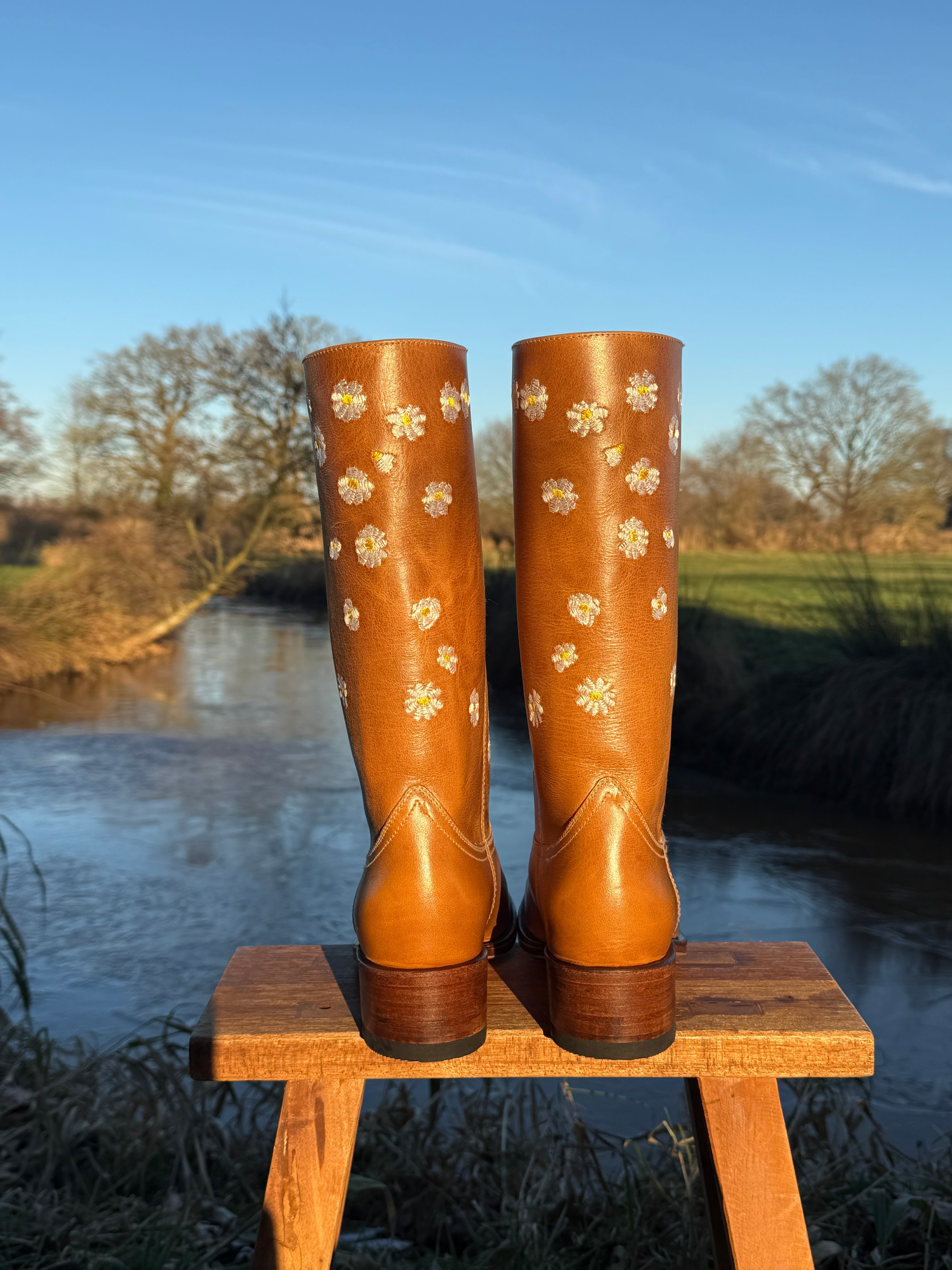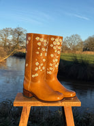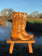 Entdecken Sie Retro-Mode mit den Daisy Boots Saddle Tan. Verziert mit wunderschönen, eleganten weißen Stickblumen, wirken diese braunen Lederstiefel wie aus einem Märchen. Handgefertigt aus feinstem Leder, passt sich dieses bezaubernde Paar Designerstiefel mit der Zeit perfekt Ihren Füßen an. Die 2 cm dicke, gepolsterte Ledersohle und der bequeme, niedrige Blockabsatz sorgen für ein federleichtes Tragegefühl.